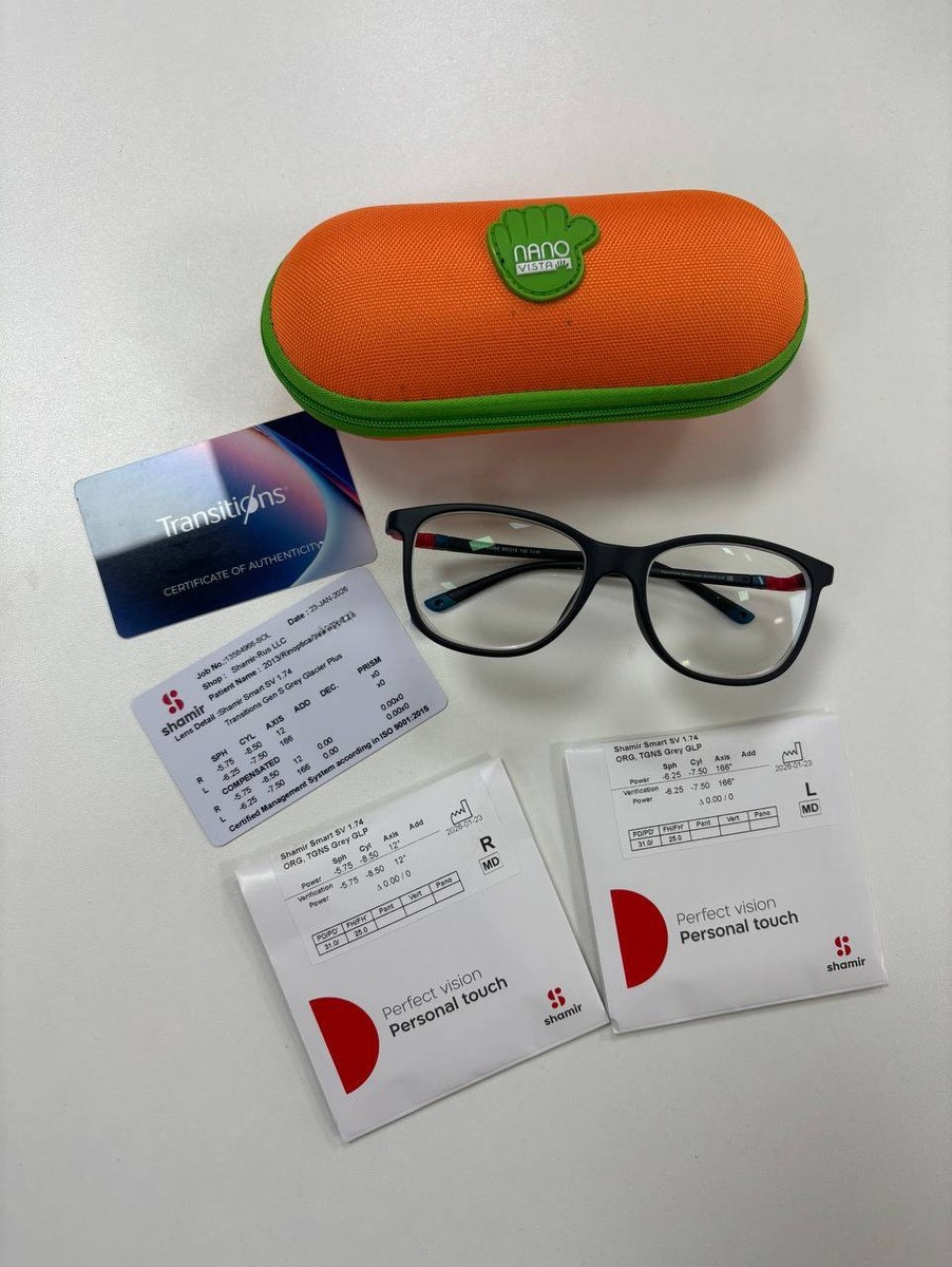 У нашего маленького пациента серьезная миопия и очень высокие значения цилиндра. OD Sph - 5.75 cyl - 8,50 OS Sph - 6,25 cyl - 7,50 Обычно у пациентов с такими диоптриями снижена острота зрения. Но этот ребенок попал к нам на прием вовремя и это далеко не первые его очки с полной коррекцией. Изначально, когда он пришел к нам в первый раз, в возрасте 5 лет, острота зрения даже в полной коррекции была всего 4 строки. Сейчас в 10 лет благодаря постоянному ношению полной коррекции он видит 10 строк, то есть имеет 100% остроту зрения в очках, чему мы очень рады. 🎉🥳 Ребенок всегда выбирает линзы с функцией фотохром. Это совершенно не противоречит рецепту и радует нашего пациента. Антивандальная оправа от испанского бренда Nano. С ней можно не бояться, что ребенок сломает очки. Это добавляет комфорта и спокойствия, как детям, так и родителям. Наталья Ринская РИНОПТИКА 👓