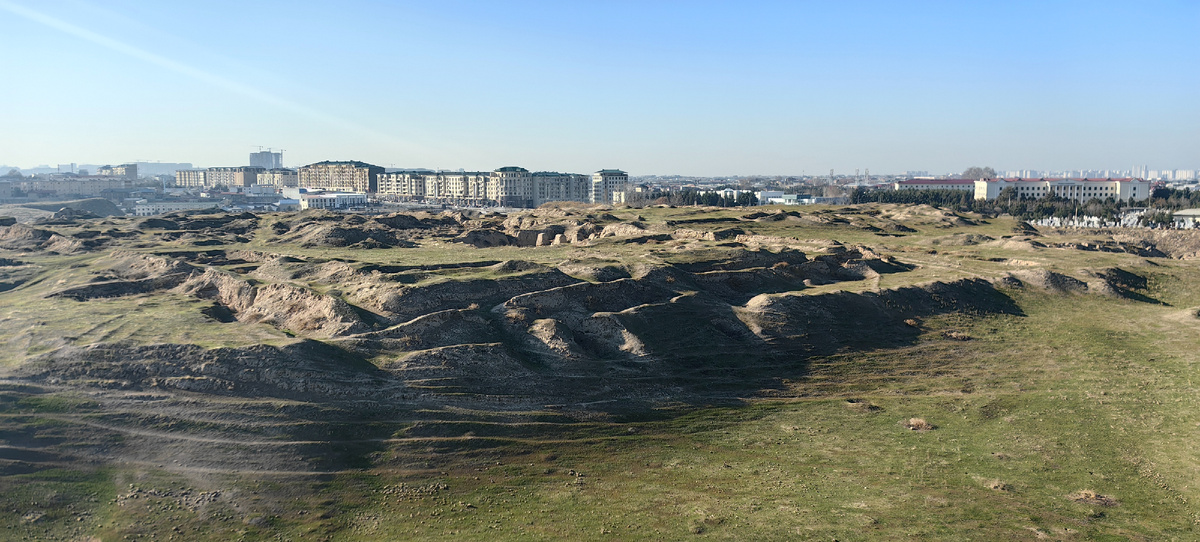 У нас это был крайний день, который мы хотели провести сегодня в одном месте — на ещё не обследованных нами руинах Афросиаба, тем более что мы не дошли тогда до руин дворца. Хотелось ещё обойтись без приключений с прогулкой по кладбищу и перелезанием через забор. Поэтому мы доехали до мавзолея Ислама Каримова и пошли вдоль дороги. Там мы увидели открытые ворота к мавзолею — те самые, что не давали нам пройти в прошлую вылазку. Дальше мы прошли к музею, где есть ворота для выхода к Афросиабу. По дороге встретились с другой русской парой, которая рассказала, что прилетели из Астаны, и сказали, что очень сложно купить билеты на аэроэкспресс до Ташкента, так как много студентов живут в Самарканде, а учатся в Ташкенте, поэтому раскупают билеты заранее. В это я очень охотно верю, так как сам покупаю билеты между Москвой и Ярославлем за два месяца. Это, кстати, нам помешало уехать в Ташкент в последние два дня нашего путешествия. Через ворота мы вышли в Афросиаб. Сразу за первым холмом повст