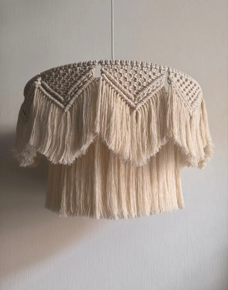 Натуральный оттенок хлопкового шнура, фактурное плетение и длинная бахрома создают мягкую, тёплую атмосферу. Такой светильник красиво рассеивает свет и добавляет пространству глубины и текстуры.