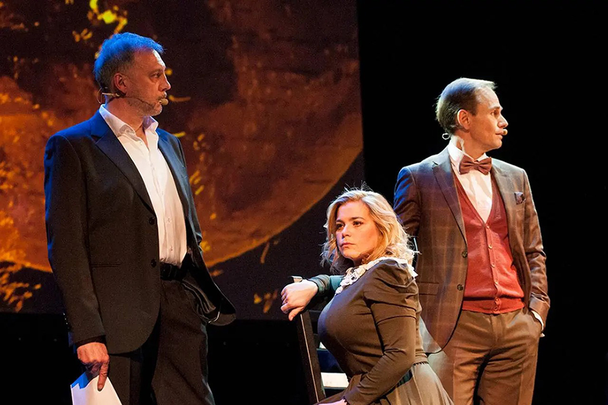 В Московском международном Доме музыки состоялась необычная премьера – спектакль «Онегин» в новой версии одного из самых необычных театров Москвы «Содружество актеров, музыкантов и…». Сергей Марин в роли Онегина, Сергей Чонишвили – автор, Сергей Шнырев – Ленский. Автор этим трём персонажам поручает развитие сюжета и тем самым меняет интонацию спектакля, его настроение. И, конечно, не обошлось тут без женщины: Татьяна в исполнении Ирины Пеговой будит воображение и вызывает желание скорее увидеть спектакль. Тем более есть в «Онегине» ещё один полноправный герой – Музыка, созданная специально к этой версии. Она звучит в живом исполнении Ансамбля «4ʹ33». Сразу скажу, что, несмотря на новую версию спектакля, создатели очень бережно отнеслись к пушкинскому слову, сохранив и блистательный текст, и увлекательный сюжет, дополнив его известными комментариями к роману – острыми, парадоксальными, современными. В текст также включены хулиганские и смешные эпиграммы самого Александра Сергеевича Пушк
