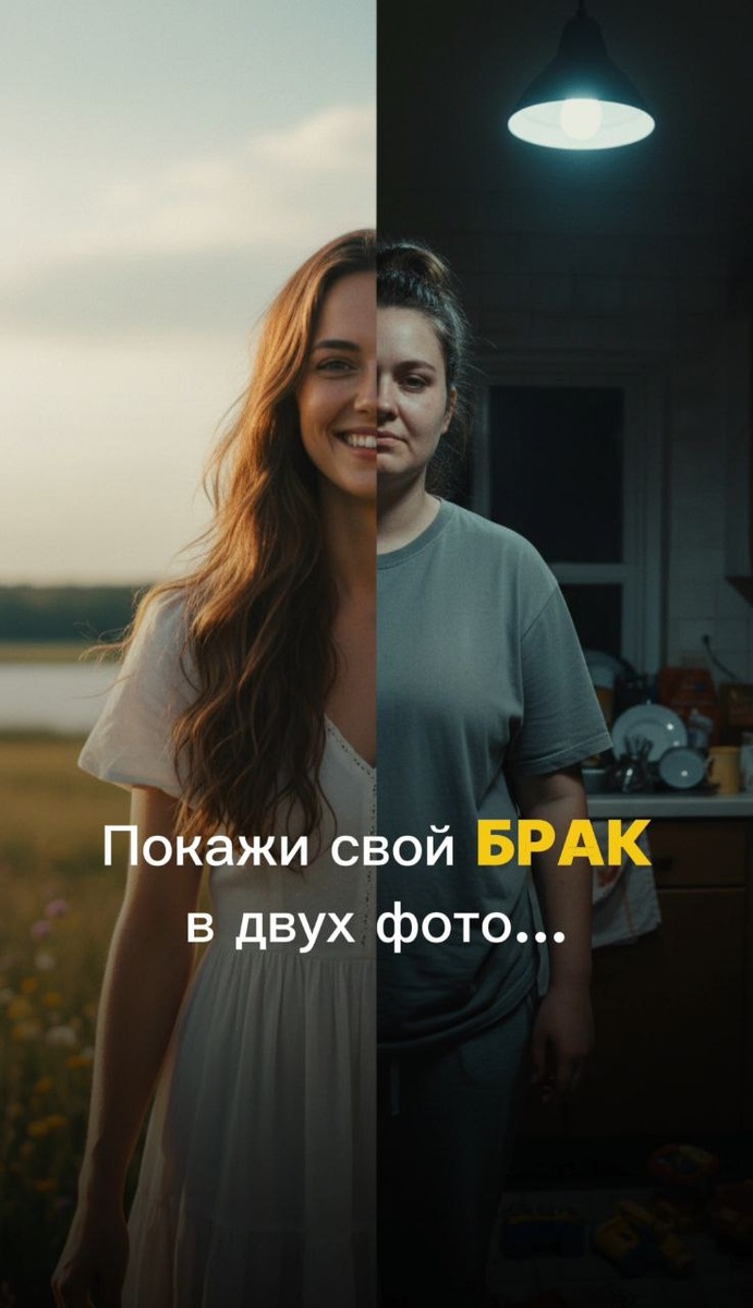 На второй - ты в домашней футболке, без макияжа, с тёмными кругами, и подпись:
