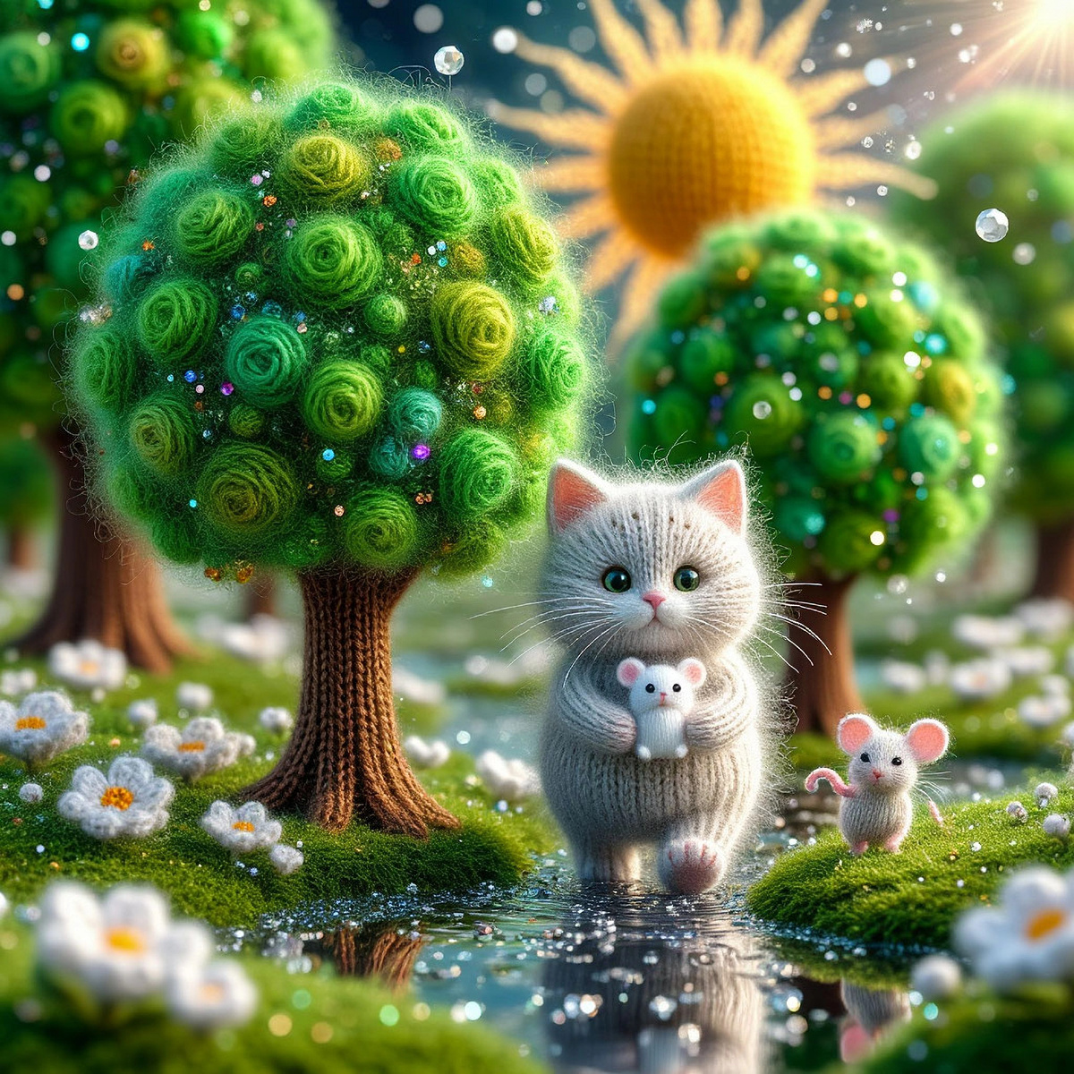 А как это счастье передать с помощью вязания? Ловите вдохновение! А теперь промт для Шедеврум, с помощью которого у меня получились такие прекрасные картинки: вязанное 3д искусство,вязанный 3д мир,пышные вязаные зеленые деревья,всё из цветных прозрачных пушистых нитей мохера и пайеток,вязанное солнце светит ярко и всё блестит, толстый пушистый кот ходит по лужам и держит в лапах вязанного крошечного белого мышонка, белые крошечные светящиеся цветочки повсюду, сверкающий размытый мечтательный фон, плавающие частицы света,филигранно, витиевато, гипердетализация, ультракрасиво, сказочно Просто копируем, вставляем в генерацию и получаем свою красоту.