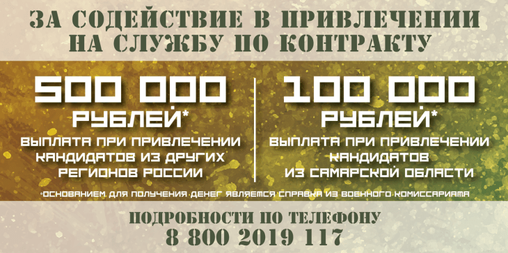 Выплату за информирование о преимуществах службы, помощь в прибытии в военный комиссариат или пункт отбора на службу по контракту сможет получить любой житель России. С 20 февраля она составляет 500 тысяч рублей при привлечении кандидатов из других регионов страны, 100 тысяч рублей при привлечении кандидатов из Самарской области.