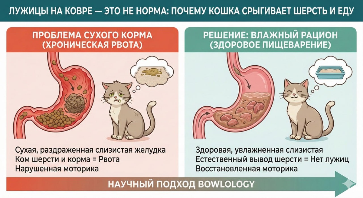 Каждый владелец кошки знаком с этим неприятным звуком по утрам. И почти каждый уверен, что регулярная уборка лужиц с шерстью или непереваренным кормом — это неизбежная часть жизни с питомцем. Производители кормов годами убеждают нас в том, что кошки просто «слишком активно вылизываются», и предлагают купить очередной сухой корм для вывода шерсти. Но ветеринарная наука говорит обратное: здоровая кошка не должна срыгивать ни еду, ни шерсть. Анатомия хищника: куда должна деваться шерсть? Кошки — облигатные (строгие) хищники. В дикой природе они съедают свою добычу целиком: с шерстью, перьями и костями. Их пищеварительная система эволюционно создана для того, чтобы пропускать этот неперевариваемый материал через желудок и выводить его естественным путем — через кишечник, в лоток. Если шерсть или еда идут в обратном направлении (через рвоту), это означает только одно: нарушена моторика желудочно-кишечного тракта. Желудок не может протолкнуть содержимое дальше, и организм вынужден экстренно