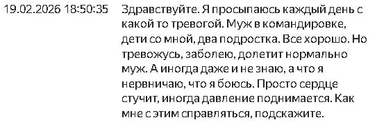 ➡️ Третий вопрос от подписчика Здравствуйте. Я просыпаюсь каждый день с какой то тревогой. Муж в командировке, дети со мной, два подростка. Все хорошо. Но тревожусь, заболею, долетит нормально муж. А иногда даже и не знаю, а что я нервничаю, что я боюсь. Просто сердце стучит, иногда давление поднимается. Как мне с этим справляться, подскажите. ✅ Мой ответ Вы спрашиваете «как справляться» — но давайте сначала разберёмся, что вообще происходит. Потому что когда вы понимаете механизм, становится легче. Вы перестаёте думать «со мной что-то не так» и начинаете видеть: это работает ваша перегруженная нервная система. И с этим можно работать. Мой развёрнутый ответ по ссылке: ➡️ Почему тревога приходит именно утром? 👉👉👉👉👉👉👉👉👉👉👉 Если чувствуете, что утренняя тревога стала вашей постоянной спутницей и самостоятельно справиться сложно — приглашаю на бесплатную демо-консультацию (2 дня переписки, разбор вашей ситуации). Подробнее: https://t.me/AlenaNeplyakh/815?single осталось
