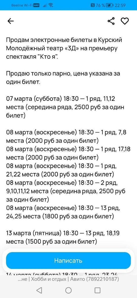 — Вчера в 12:00 должна была открыться продажа на премьерный спектакль, который будет идти в течение всего марта. В 12:15 билетов уже не было ни на один день. Люди в комментариях писали, что в 11:57 их было уже 70% продано. Зато на популярном сайте бесплатных объявлений у перекупов их навалом, — пишет в наш чат-бот подписчица. Официальная цена билета на мартовский спектакль с учетом комиссии сервиса составляет 1000 рублей. Однако у перекупов цена значительно дороже. Один билет продают по цене от 1500 до 2500 рублей. Отметим, что на спекуляции с билетами театра жаловались уже не раз. В театре вместе с тем заранее предупреждают, что из-за большого спроса билеты раскупают очень быстро. — Нужно в процедуре продажи что-то менять, — резюмирует обратившаяся в редакцию курянка.