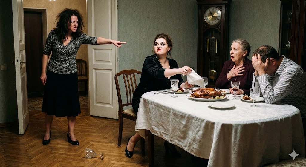 За столом собралась «семья». Ее муж, Павел, сидел во главе стола, с аппетитом уплетая картошку и изредка подливая себе коньяк. Справа от него расположилась Зинаида Петровна — свекровь, женщина с поджатыми, вечно недовольными губами и цепким взглядом инспектора налоговой службы. А напротив Анны сидела Рита. Золовка.