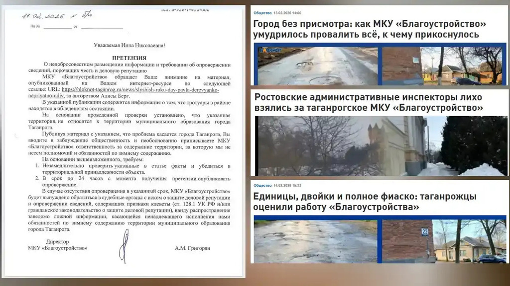 Интернет-издание «Блокнот Таганрог» опубликовало реакцию актёра Павла Деревянко — уроженца города — на состояние таганрогских дорог и тротуаров зимой. Никаких обвинений, никаких виновных — просто человек приехал на родину, посмотрел под ноги и расстроился. Как и большинство жителей города, если честно. Казалось бы, история на этом заканчивается. Но нет. МКУ «Благоустройство» — муниципальное казённое учреждение, полностью финансируемое из городского бюджета, то есть из налогов тех самых жителей, которые всю зиму фотографировали сугробы и ямы — направило в редакцию претензию. Директор учреждения Григорян потребовал опубликовать опровержение в течение 24 часов и, по имеющимся данным, намекнул на уголовную статью. За публикацию о том, что актёру не понравились дороги. «Блокнот», судя по всему, удивился. А потом сел писать. Следующие несколько дней издание методично публиковало материалы о работе МКУ «Благоустройство»: про проваленные мероприятия, читательские оценки с преобладанием еди