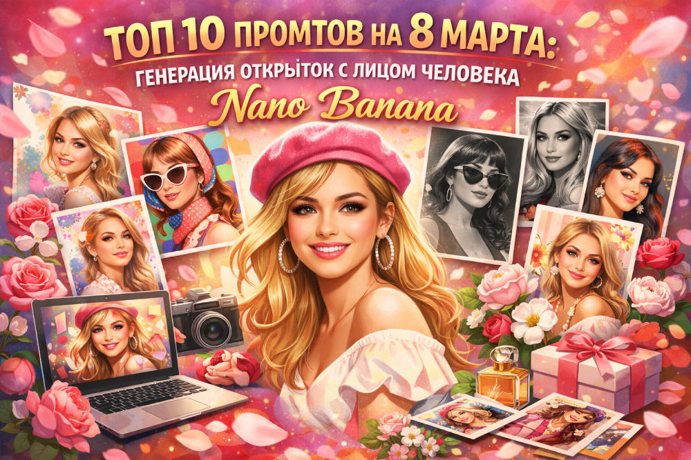 8 марта — отличный повод порадовать близких необычными подарками. Если вы ищете свежие идеи что подарить девушке на 8 марта или думаете что можно подарить девушке на 8 марта, современные нейросети способны творить настоящие чудеса. С помощью ИИ на 8 марта можно создавать персональные открытки, фото и даже мини-фильмы, которые будут уникальными и трогательными. Сегодня мы разберем ТОП 10 промтов для генерации открыток с лицом человека от Nano Banana и дадим конкретные идеи для вашего праздника.