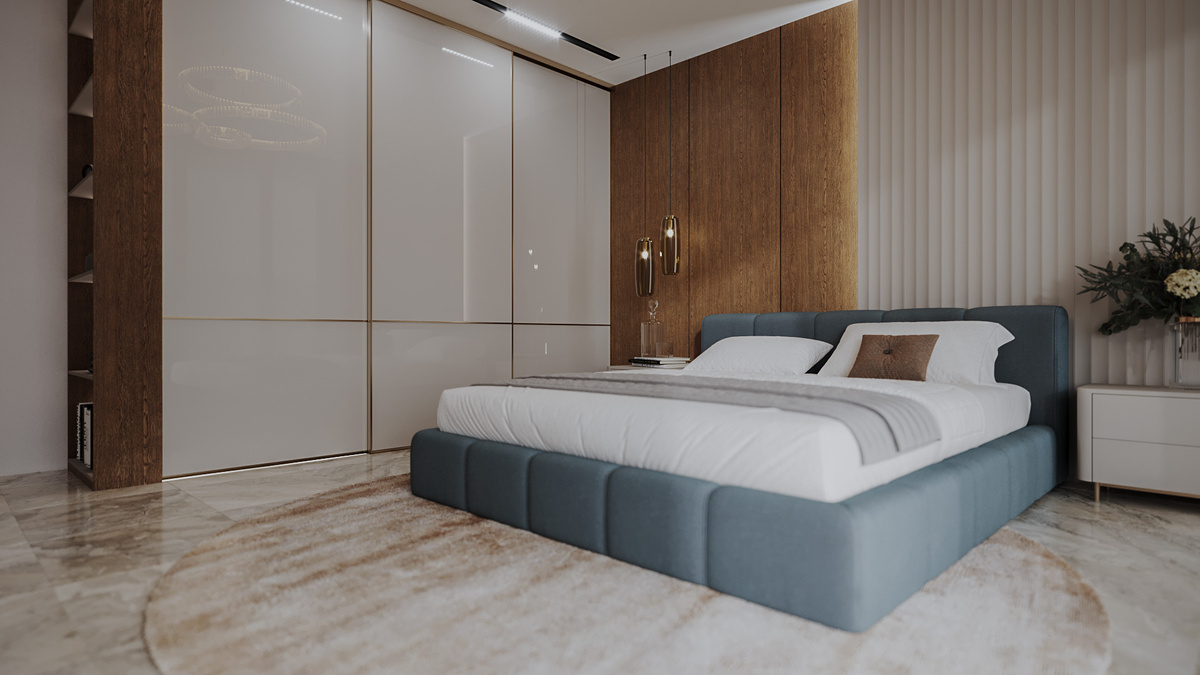 Хотите спальню, где каждая деталь работает на уют и порядок? Разбираем интерьер спальни — 5 решений, которые визуально «удорожают» интерьер. Трехдверный встроенный шкаф с системой профилей в цвете Латунь и заполнением из окрашенного стекла Кашемир. Почему это работает: Совет: Для небольших спален выбирайте светлые глянцевые фасады (в меру и на контрасте с матовыми материалами) — комната будет казаться просторнее. Двухдверный шкаф с консолью напротив кровати. Подвесная конструкция не загромождает пол. Преимущества: За изголовьем — панели из ЛДСП с текстурой глубоко брашированного дуба. Что даёт: Деталь: Декор Дуб Бельмонт имитирует древесину дуба 70-х годов с выразительными годичными кольцами. Белые структурные панели создают контраст с темным деревом. Эффект: Лаконичные тумбы в цвете Кашемир серый на тонких ножках. Почему удобно: Проект показывает, как сочетание 3 декоров (дерево + серый + латунь) создает сбалансированный интерьер. Встроенная мебель экономит место, подвесные конструкци