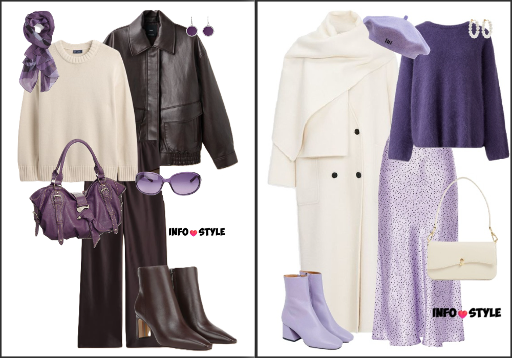Монохром остаётся одним из ключевых приёмов сезона, который неизменно строится на игре оттенков и фактур. Светлая лаванда может сочетаться с более насыщенным сиреневым или сливовым, при этом важно использовать разные материалы. Например шёлковая блуза, матовые брюки и мягкий трикотажный кардиган в одной цветовой гамме - такой образ выглядит продуманным и визуально вытягивает силуэт.