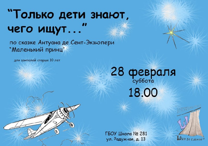 🤩 Театральная студия «Шум за сценой» приглашает на спектакль «Только дети знают, чего ищут...» по сказке Антуана де Сент-Экзюпери «Маленький принц». 👑 🗓 28 февраля 🗓 Суббота ⏰ 18:00 📍 Ул. Радужная, д. 13 ❗️ ДЛЯ ЗРИТЕЛЕЙ СТАРШЕ 10 ЛЕТ 📌О СПЕКТАКЛЕ: «Жил да был маленький принц. Он жил на планете, которая была чуть больше его самого. И ему очень не хватало друга…» Всемирно известная и любимая история, написанная Антуаном де Сент-Экзюпери, лётчиком по профессии, разобранная на цитаты, вновь оживает на сцене нашего театра. Спектакль о поиске себя. О глотке живительной воды в пустыне одиночества. О смысле жизни и его удивительной простоте. О главном, которое не увидишь глазами. О том, как пройти по пути возврата в детство и услышать смех звёзд. Спектакль «Только дети знают, чего ищут…» - для взрослых, которые были детьми. Ведь «…все взрослые сначала были детьми, только мало кто из них об этом помнит». 🔗 ПРЕДВАРИТЕЛЬНАЯ ЗАПИСЬ 📣 Школа № 281 в MAX #ДОНМ #РоссияМояРодина