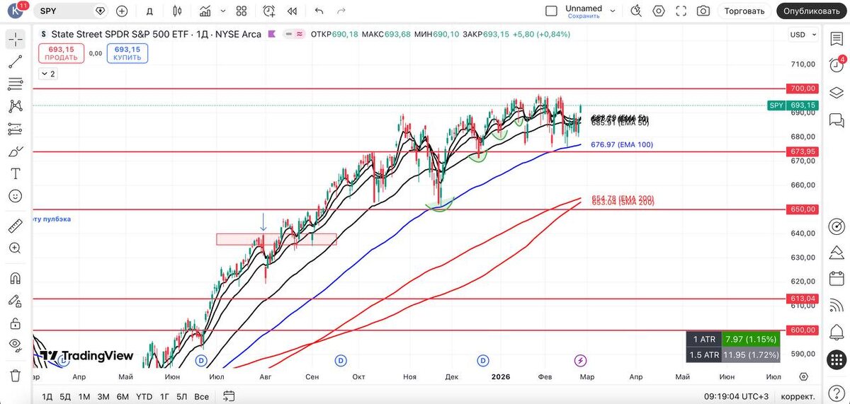 Однако в последнее время мы часто наблюдаем, как они пробивают её в обе стороны, то же самое и на $SPY. И пока мы не увидим уважения к этой скользящей, не можем точно сказать, куда пойдет цена дальше. На $SPY нет сетапа на дневном графике, и пока что действуем в направлении тренда, исходя из других инструментов, о которых писал ранее. Сегодня понаблюдаем за $VIX — покажет ли реакцию на 200 EMA D как на поддержку, что может привести к красному дню на рынке. И как всегда важен недельный контекст — идет формирование, и выглядит очень позитивно. #spy #технический_анализ #америка #трейдинг_сша #фондовый_рынок #обзор #вывод #qqq #vix #smh #mags #xlk #ixic