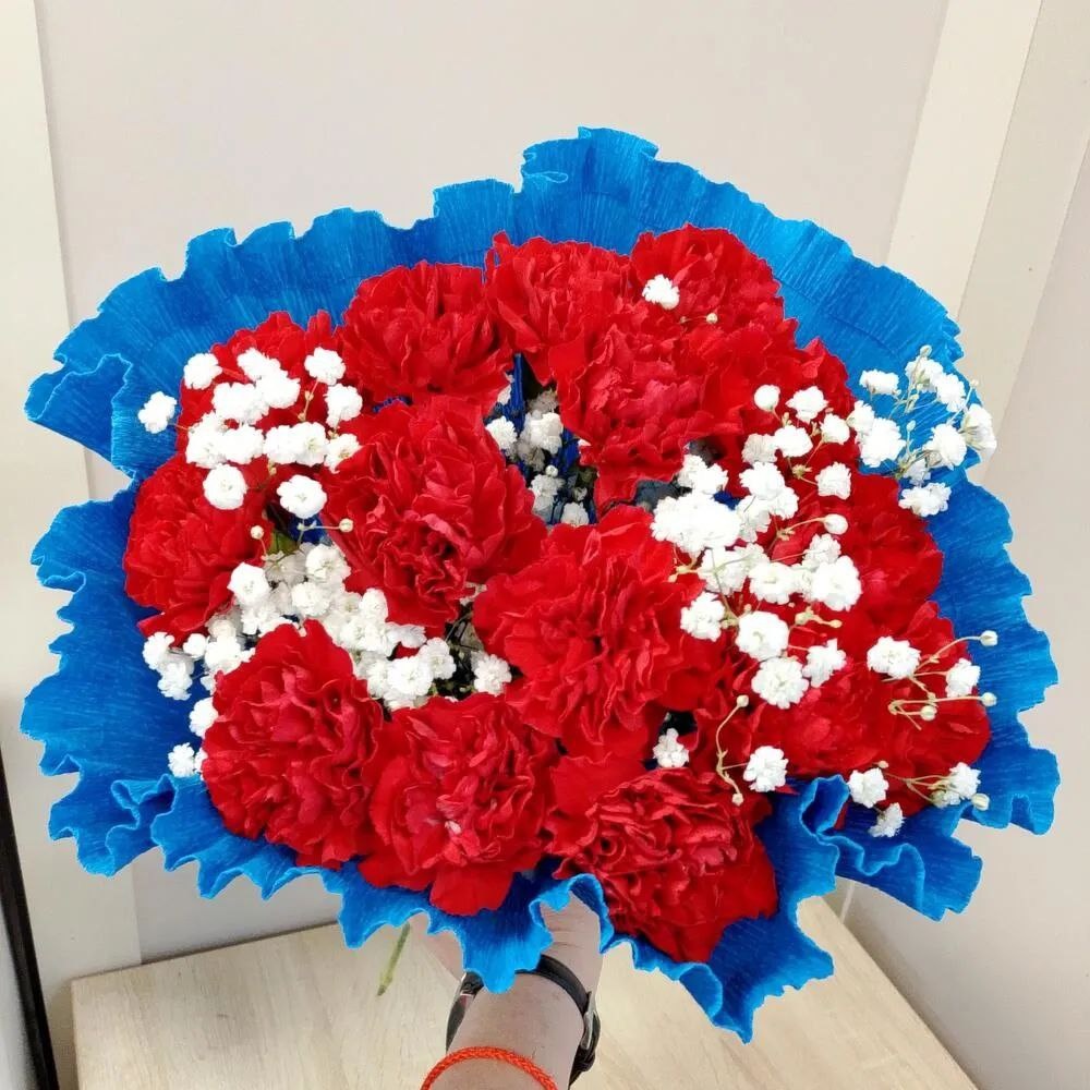 Авторский букет цветов из Красных Гвоздик и Белой Гипсофилы "Синие Мечты с Красным Огнем"