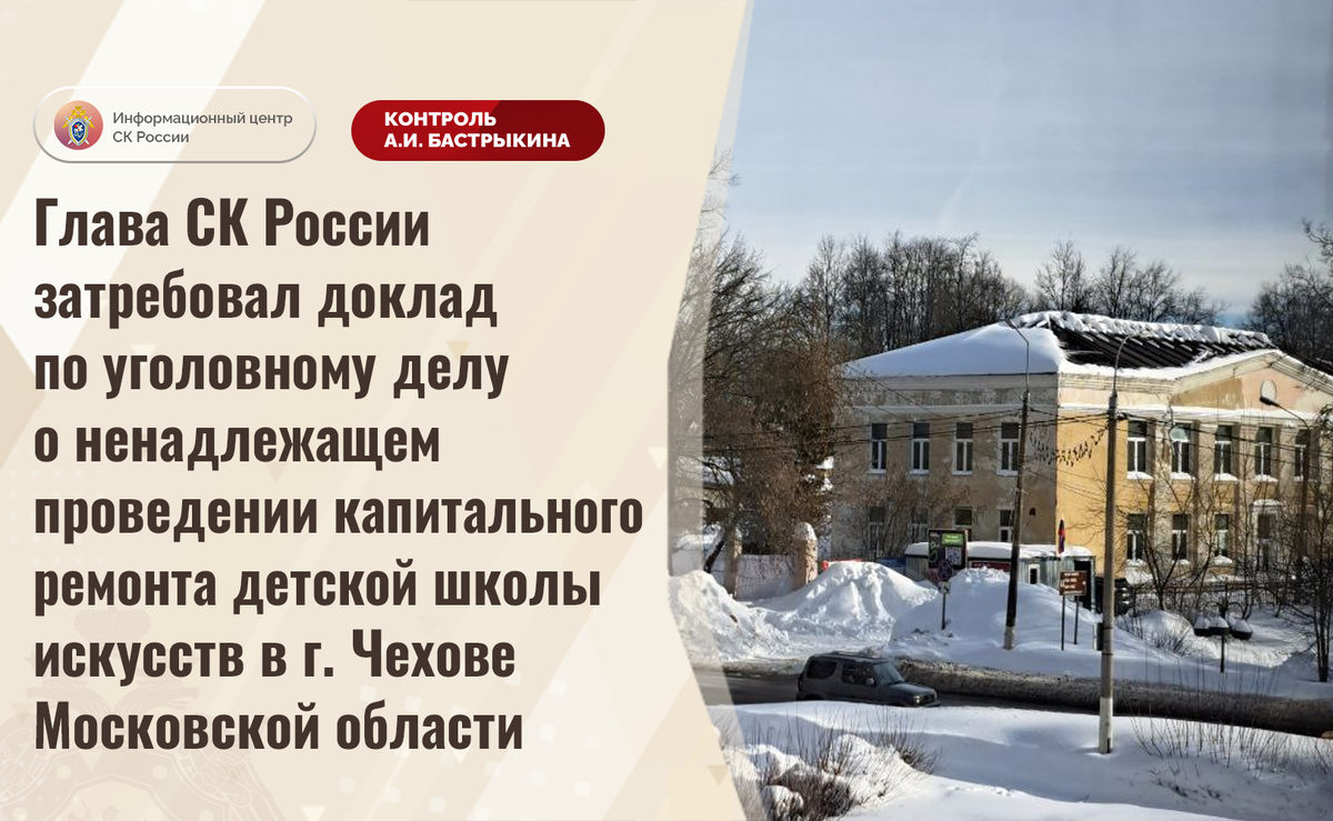 Глава СК России затребовал доклад по уголовному делу о ненадлежащем проведении капитального ремонта детской школы искусств в г. Чехове Московской области В сети Интернет сообщается о ненадлежащем проведении капитального ремонта детской школы искусств в городе Чехове Московской области. В 2024 году в здании 1965 года постройки начались ремонтные работы, которые к установленному на сентябрь 2025 года сроку завершены не были, в связи с чем сдача объекта перенесена на первый квартал текущего года. При этом в феврале произошло обрушение временных перекрытий кровли, ввиду чего здание находится в непригодном состоянии. В результате дети вынуждены посещать занятия в других учреждениях. В ГСУ СК России по Московской области возбуждено уголовное дело. Председатель Следственного комитета Российской Федерации Александр Иванович Бастрыкин затребовал у руководителя ГСУ СК России по Московской области Ярославу Александровичу Яковлеву доклад о ходе и результатах расследования уголовного дела. Исполне