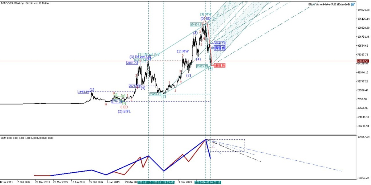 💼#BTCUSD, #bitcoin, добавлю еще вариант ценового движения биткойна (предыдущий пост тут) , с формированием волновой модели , начальным диагональным треугольником⚡️ , закончилось волна [4] или нет ? для того чтобы получить сигнал для волны [5] построены вилы Эндрюса с красной зоной , зона риска , по выходу из нее и будет приниматься решение об открытии сделки и возможном завершении волны [4], автор➡️ @vestnik_voln⭐️