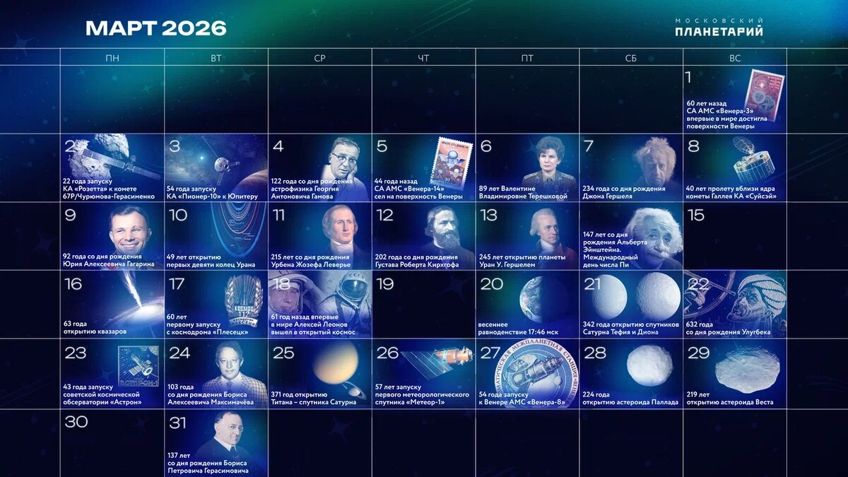 Избранные даты и события марта 2026 года в астрономии и космонавтике: