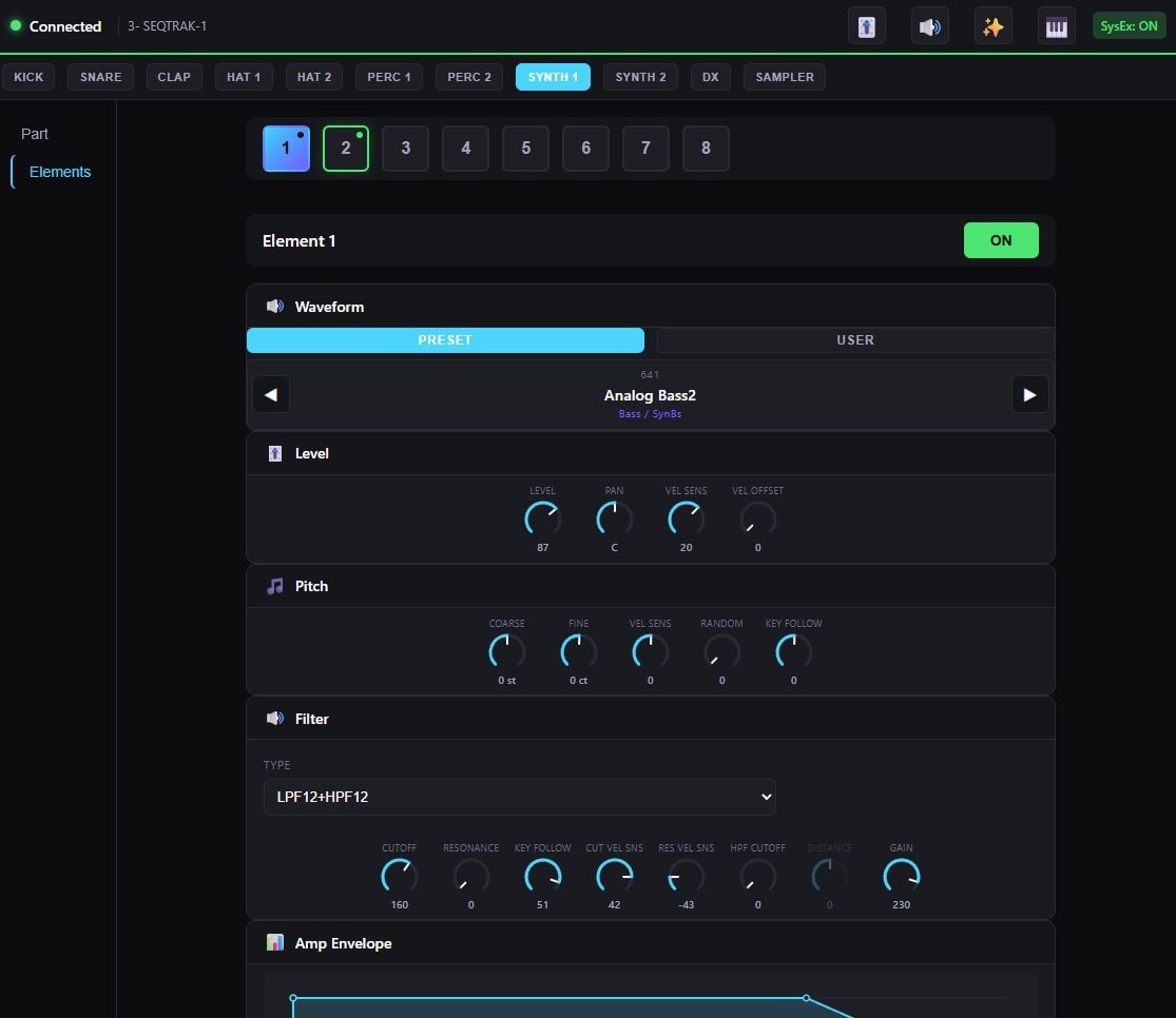Пока находится в ранней альфе, но уже работает и имеет ряд параметров которые недоступны через оф. прилагу. — Редактор партий (Drum-треки, Synth 1, Synth 2, DX Synth, Sampler) — 8-элементный редактор для Drum и Synth-треков с возможностью выбора форм волны (включая пользовательские волны!) — Редактор DX Synth — Базовый редактор сэмплера с возможностью выбора пользовательской формы волны для элементов. — Микшер треков с управлением уровнями посыла и сухого сигнала, включая входы A/D и USB! — Эффекты: управление уровнями посыла, мастер-эффектами, эквалайзером и т.д. — MIDI-управление с возможностью внешнего управления и базовой функцией MIDI Learn для регуляторов уровня партий AWM2 (секции фильтра и усилителя). Быстренько прошелся — работает! ) Будем следить за развитием. Работать, кстати, может и оффлайн просто в виде HTML-файла если скачать страницу )) #usefull #seqtrak #yamaha #gear