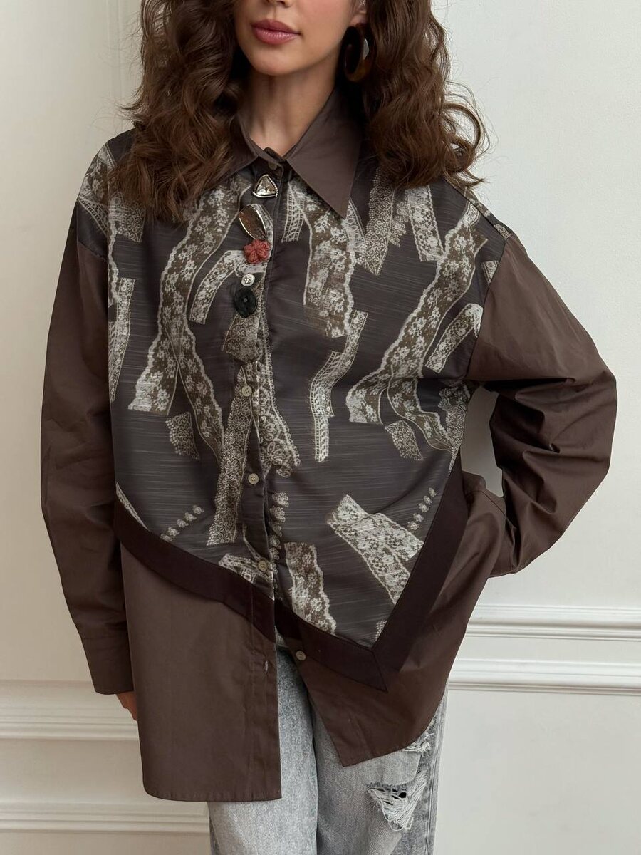 🍂 Рубашка, которая точно не останется без внимания в вашем гардеробе! Цветы сплелись в кружевные узоры, соединяя строгость английского воротника и асимметричный подол с акцентными пуговицами. Предлагаем дополнить рубашку джинсами в стиле гранж, чтобы сохранить баланс между ностальгией и современностью.
