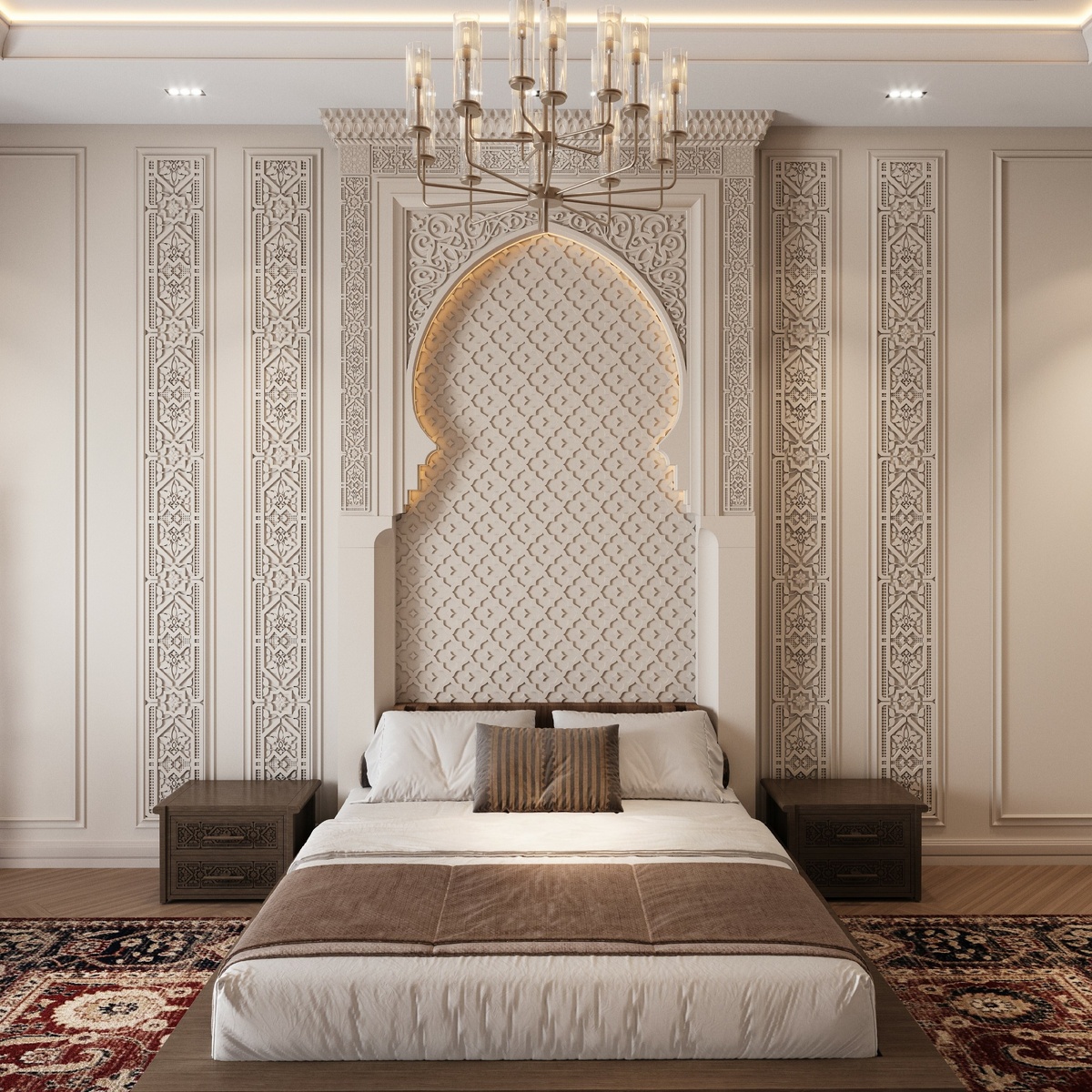 🏘️ ✨ Богатые орнаменты на стенах ✨ Арочная ниша с подсветкой ✨ Гармоничное сочетание текстур и оттенков Хотите создать столь же впечатляющий интерьер у себя дома? Звоните: 8 (800) 707-52-95, 8 (495) 150-21-95, мы поможем воплотить ваши мечты в реальность! 💫 Автор проекта: @ibekov_design
