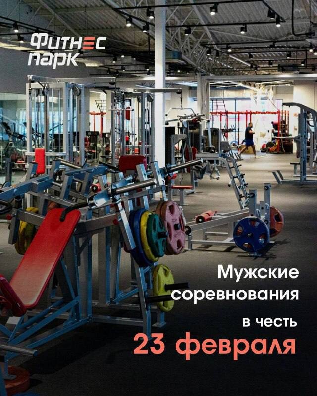 ! В честь Дня защитника Отечества мы организуем спортивные соревнования, где каждый сможет проявить свои богатырские качества! Вы можете принять участие в трёх дисциплинах: 🏋️ Жим штанги (половина вашего веса) на максимальное количество раз. 💪 Подтягивания на максимальное количество раз. ⏱️ Удержание планки на время. Чтобы принять участие, с 19 по 23 февраля обратитесь к дежурному тренеру Фитнес Парка. Он расскажет все подробности и зафиксирует ваш результат. Итоги будут объявлены 23 февраля в наших социальных сетях, а победителей ждут призы! Ждем всех, кто готов бросить вызов себе и другим! Докажите, что вы — настоящие защитники!