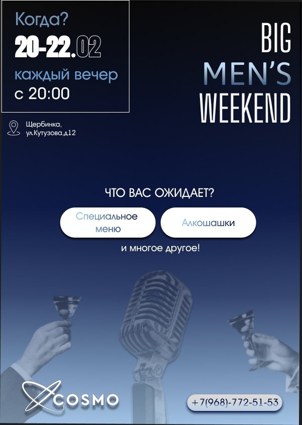 🥘 🔥 BIG MEN’S WEEKEND — время для стильного отдыха! Когда? 20–22 февраля Каждый вечер с 20:00 до утра Вас ждёт: ✨ Специальное меню 🍹 Авторские коктейли 🎤 Атмосфера живой музыки и отличного настроения …и многое другое! Собирайте друзей и проведите вечер в приятной компании — будет громко, вкусно и незабываемо 😉 📞 Бронь столов: +7 (968) 772-51-53 📶 Категория: Ресторан 🏢 Место: Ресторан-караоке "Cosmo" 📍Адрес: г. Подольск, Щербинка, ул. Кутузова, 12 БЦ Strotskis, этаж 5 ⏱ Часы работы: Пн-Чт: 12:00 – 23:00 Пт-Сб: 12:00 – 05:00 Вс - выходной. ✅ Где поесть, Подольск!? https://dzen.ru/id/6756016c107ef731969e16a5 https://vk.com/gde_poest_podolsk https://dzen.ru/gde_poest_v_podolske