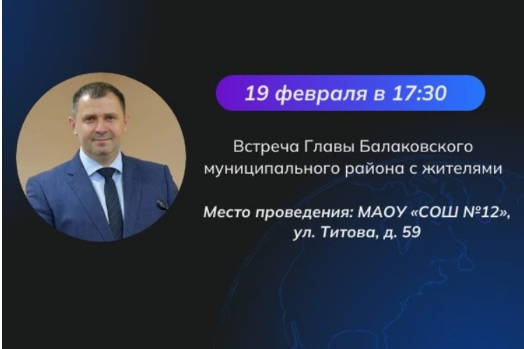 Сегодня, 19 февраля 2026 года в 17:30 в СОШ №12 по адресу: г. Балаково, ул. Титова, 59 состоится встреча Главы Балаковского муниципального района с жителями, проживающими в границах улиц Титова, Ленина, Академика Жук. Припасайте свои самые проникновенные речи и самые острые неразрешимые вопросы.