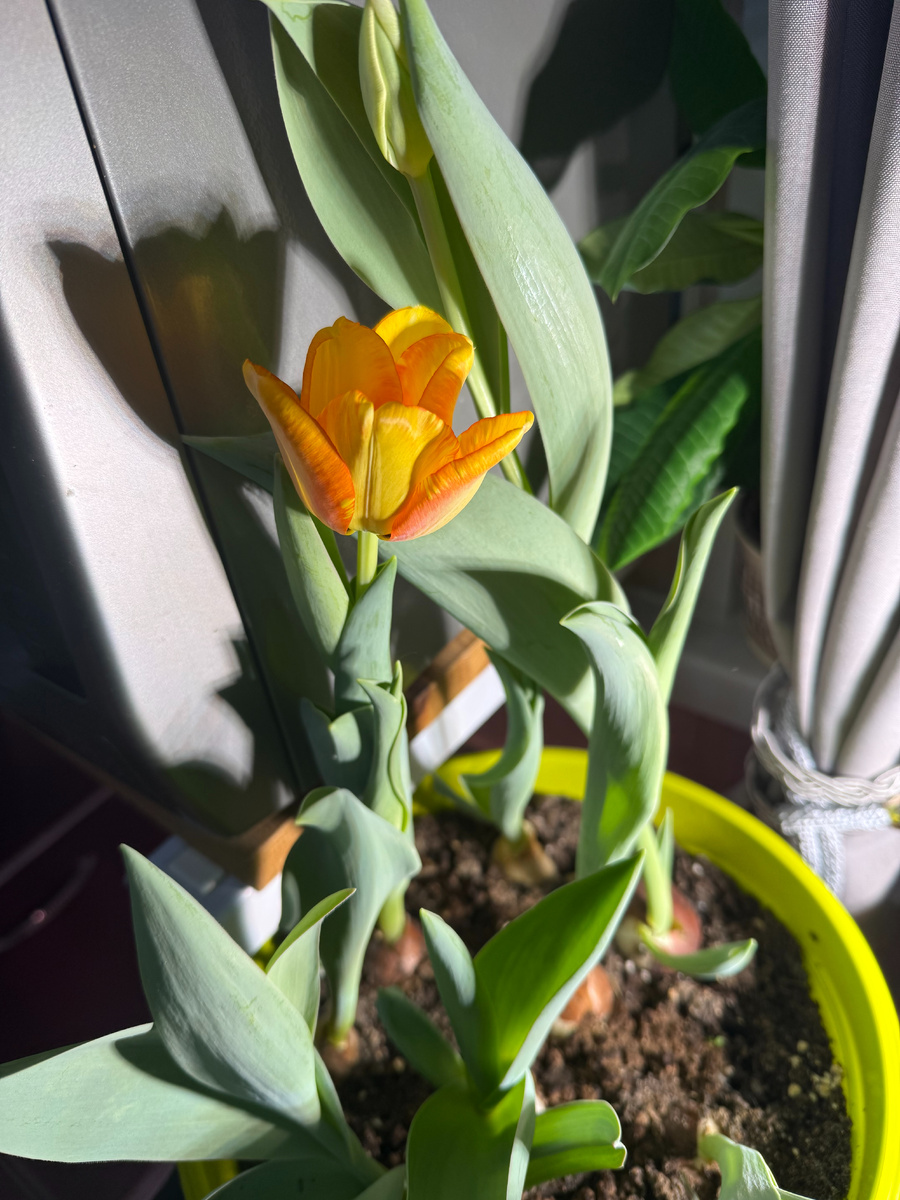 Сегодня, придя утром на кухню, я увидела ярко жёлтое пятно у окна - это в наш дом пришла весна, пусть и немного раньше. Ещё в ноябре, я посадила на выгонку тюльпаны, накрыла их тёмной плёнкой и вынесла на балкон - это был мой первый опыт выгонки тюльпанов к 8 марта. Отсчитав нужное количество дней, я пометила себе, что занести их в тепло нужно будет 5 февраля, что бы к 8 марта они распустились! Но тепло от батарей, и досветка рассады, которая стоит рядом - сделали своё дело, и тюльпан (пока только 1 из 9) - решил что пора! На самом деле, я думала что его сосед (рядом на фото виден бутон) распустится раньше, потому что ещё вчера вечером мне казалось, что бутон ещё не готов, а оказалось - уже созрел. Я вдохнула этот нежный, еле уловимый аромат и настроилась на день. Хоть на улице у нас сегодня облачно солнца совсем нет (а вот вчера было), -11, к вечеру обещают снегопад, в нашей квартире уже зарождается весна!