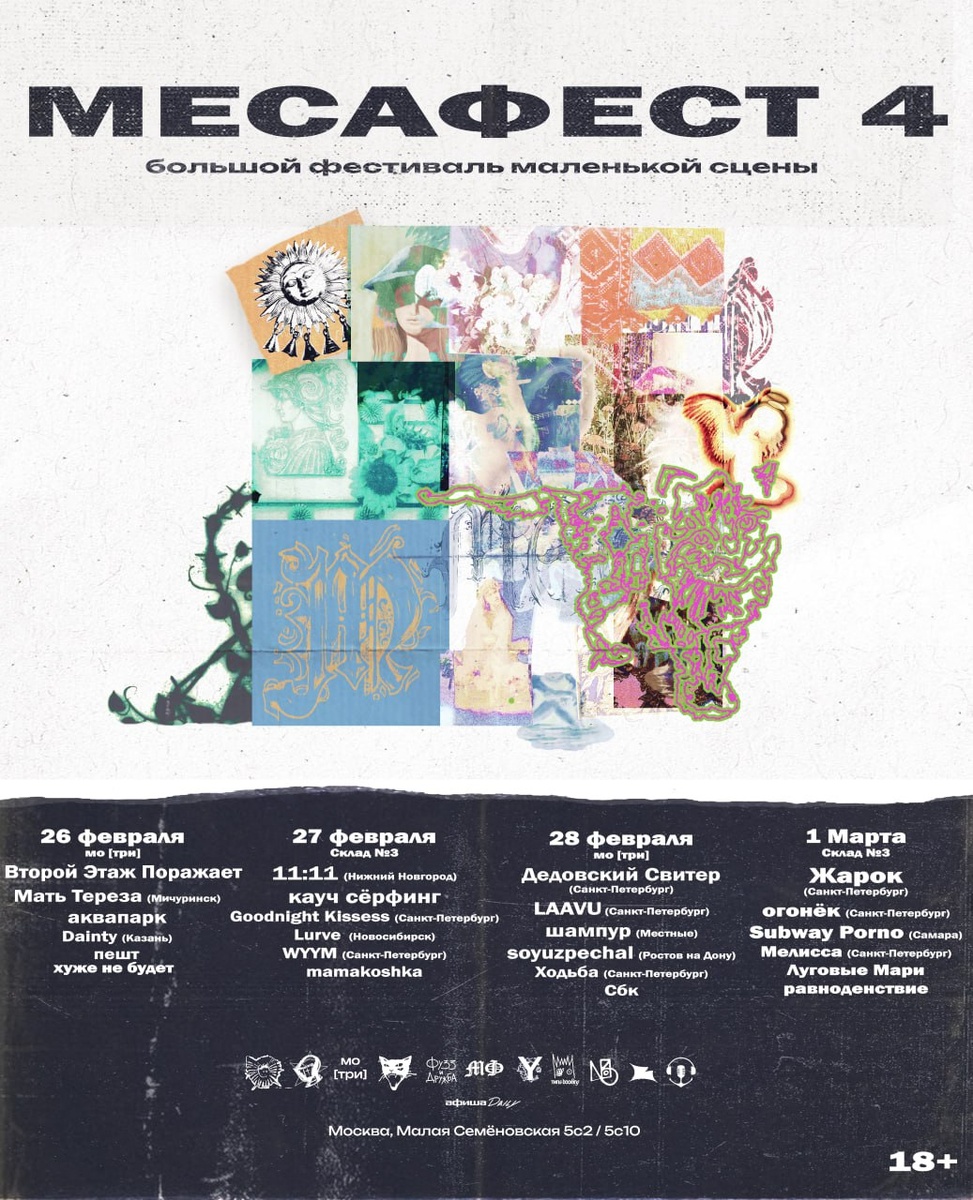 #alternative #avantgarde #emo #experimental #folk #indie #metal #pop #post #postpunk #rock #screamo #shoegaze #triphop ► месафест 4 ● TG ● VK Большой фестиваль маленькой сцены, 4 дня, 7 городов, 2 сцены, от шугейза и трипхопа до металкора. Участники: ► Второй Этаж Поражает ● TG ● VK ► Жарок ● TG ● VK ► Subway Porno ● VK ► Огонёк ● TG ● VK ► LAAVU ● TG ● VK ► Дедовский Свитер ● TG ● VK ► WYYM ● TG ● VK ► Шампур ● TG ● VK ► Кауч Сёрфинг ● TG ● VK ► Луговые Мари ● TG ● VK ► Soyuzpechal ● TG ● VK ► Мать Тереза ● TG ● VK ► Lurve ● TG ● VK ► Аквапарк ● TG ● VK ► Mamakoshka ● TG ● VK ► Мелисса ● TG ● VK ► Ходьба ● TG ● VK ► Dainty ● TG ● VK ► 11:11 ● TG ● VK ► Goodnight Kisses ● TG ● VK ► Хуже не будет ● TG ● VK ► Равноденствие ● TG ● VK ► Пешт. ● TG ● VK ► Сбк ● TG ● VK Билеты от 950₽