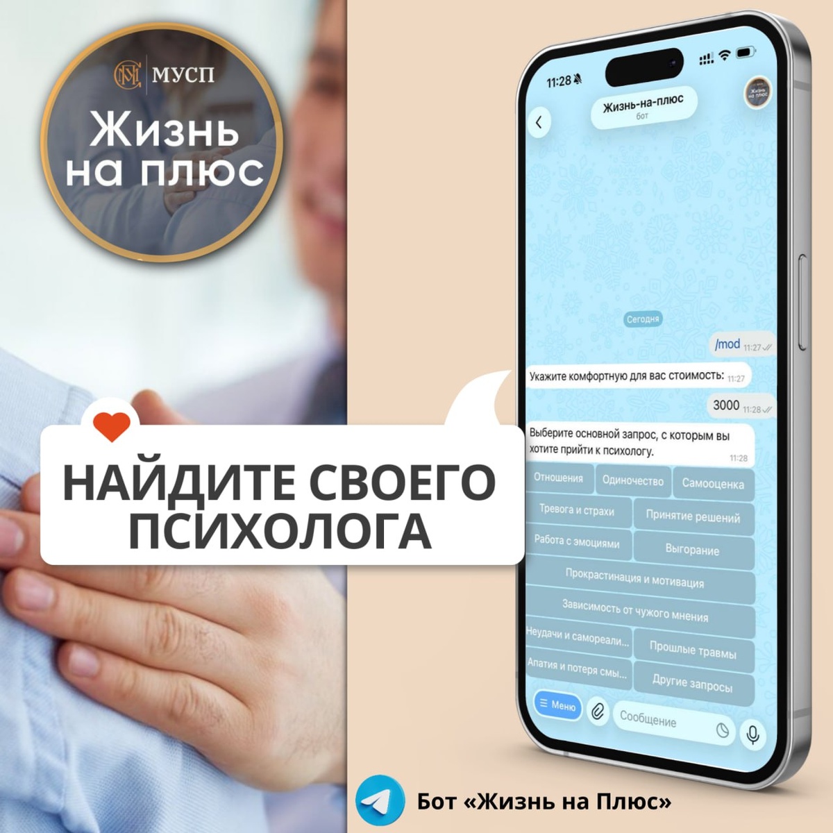 Но в одиночку все равно бывает трудно. В такие моменты особенно нужна поддержка - человек, который разбирается в психологии и помогает пройти путь рядом, спокойно и профессионально. 📱Если вы в поиске специалиста, у нас есть удобный способ подобрать «своего» психолога - бот «Жизнь - на - плюс». В нем можно найти психолога под ваш запрос и выбрать среди специалистов, которые связаны с МУСП и уже зарекомендовали себя в работе. Как это работает: 🔵 выбираете запрос (отношения, семья, тревога, выгорание и другое); 🔵 отмечаете, что для вас важно (формат, подход, с чем хотите работать); 🔵 получаете подборку психологов и выбираете того, кто вам откликается. 🔗 Перейти ➡️ в бот «Жизнь - на - плюс».