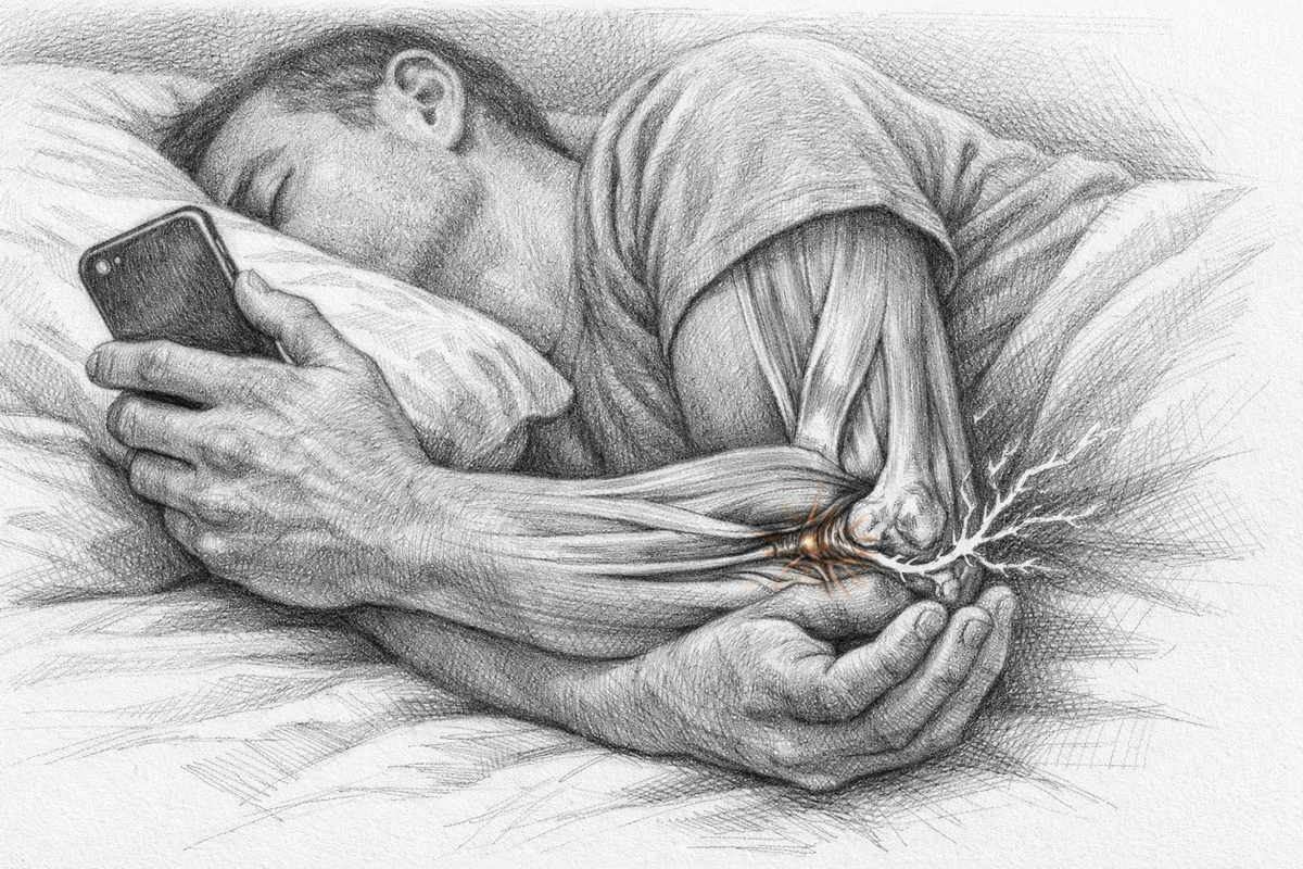 Лёжа с телефоном, немеет рука и мизинец. Чаще всего локтевой нерв пережимается у локтя, это называется синдром кубитального канала. Типично: немеет мизинец (и нередко половина безымянного), особенно когда локоть подолгу согнут (например, лёжа с телефоном). Подписывайтесь на Позвоночник • Суставы • Нервы про суставы и позвоночник без🤖 искусственного интеллекта, только знания накопленные опытом. Локтевой нерв проходит в узком канале у локтя. Когда локоть подолгу согнут или вы опираетесь на локоть, нерв натягивается и/или сдавливается, отсюда и возникают онемение и покалывание в зоне мизинца. Цель 🎯 убрать провоцирующее сдавление. Отдельный частый сценарий: зимой на балконе у окна люди подолгу опираются локтями на холодный подоконник или раму — и симптомы усиливаются. Положение ночью.