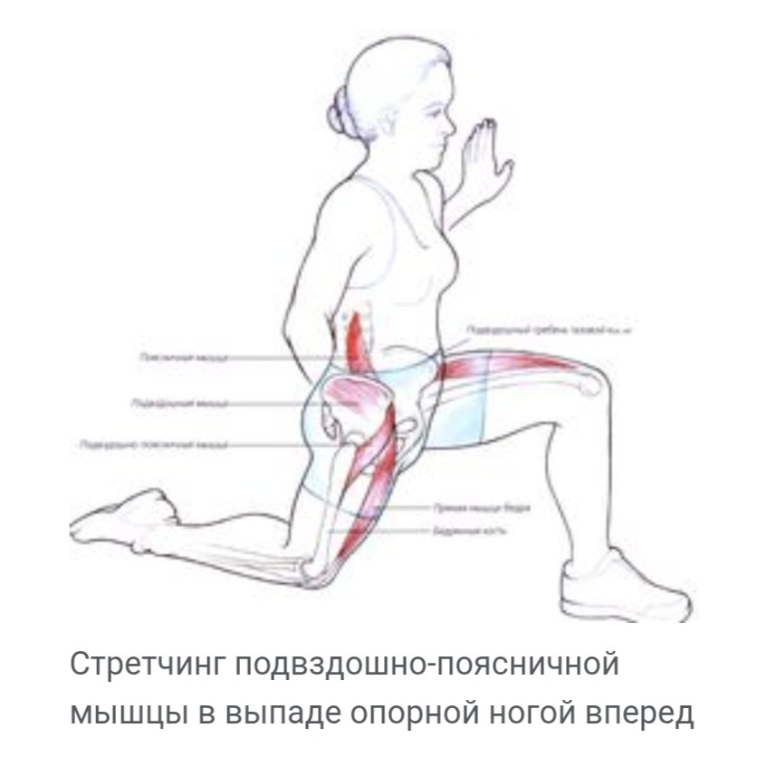 · Мягко подайте таз вперёд и чуть вниз. Почувствуйте растяжение в левом паху. Держите 20-30 секунд. Поменяйте ноги.