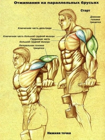 Отжимания на брусьях — превосходное упражнения для развития грудных мышц и трицепсов.
