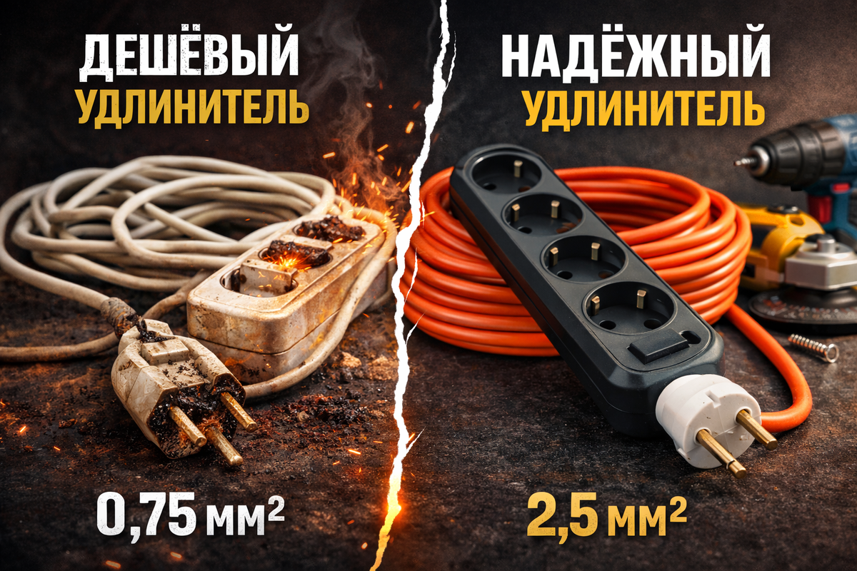 Удлинитель в гараже — это не «аксессуар», а полноценная часть проводки. Я видел, как дешёвая «сопля» грелась так, что изоляция становилась мягкой. И всё это под обычной болгаркой. Проблема простая: покупают по длине и цене. А надо — по сечению и нагрузке. Сейчас разложу по полкам, без теории и рекламных сказок. Удлинитель — это просто кусок провода с розеткой. Через него идёт ток. Чем тоньше провод — тем больше сопротивление.