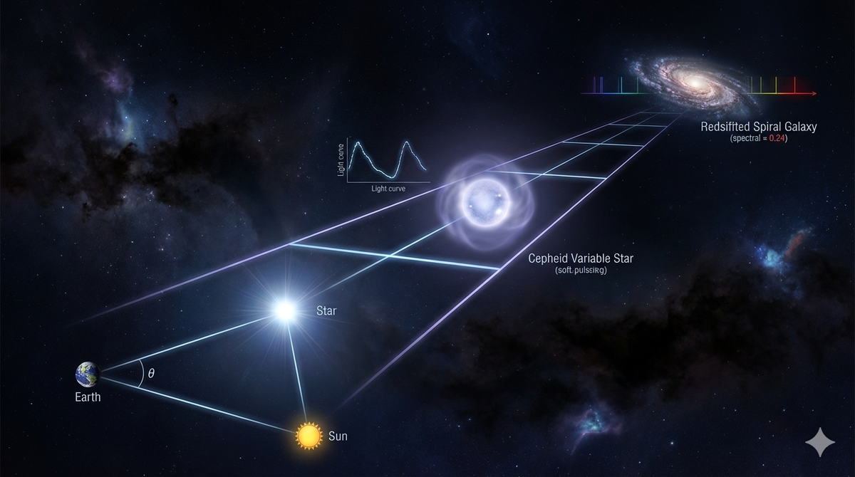 Но у астрономов есть система, которую называют лестницей космических расстояний. Разберёмся, как она работает. Когда Земля движется вокруг Солнца, близкие звёзды слегка смещаются на фоне далёких. Это крошечное смещение и есть параллакс. Чем меньше угол смещения — тем дальше звезда. Так можно измерять расстояния до сотен и тысяч световых лет. Но дальше этот метод уже не работает. Некоторые звёзды периодически меняют яркость. Главное открытие: