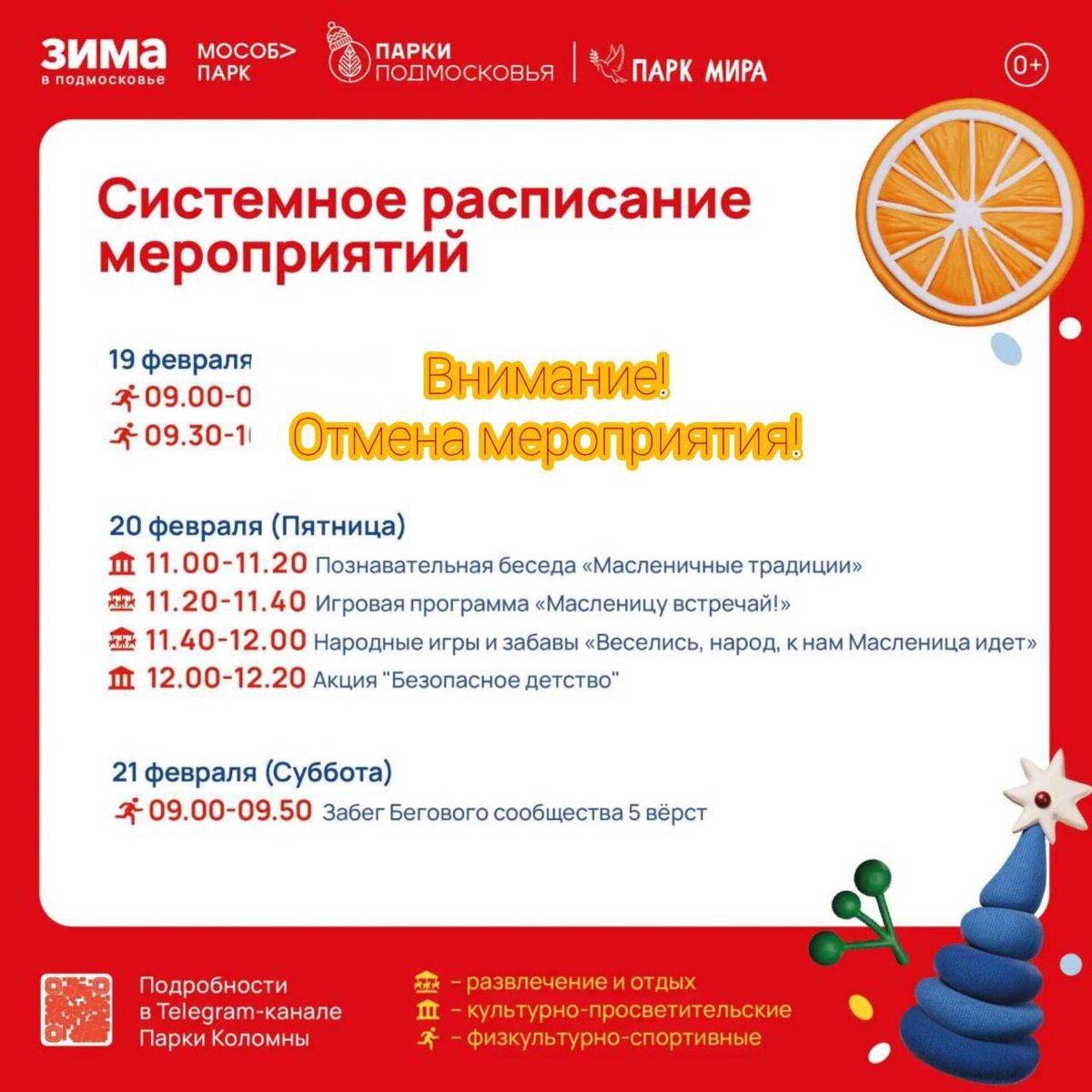 Друзья! 🥲 Нам очень жаль, но запланированное на сегодня мероприятие в Парке Мира отменяется. 👍 Будем рады видеть вас на наших будущих событиях! #ПаркиКоломны #ПаркМира