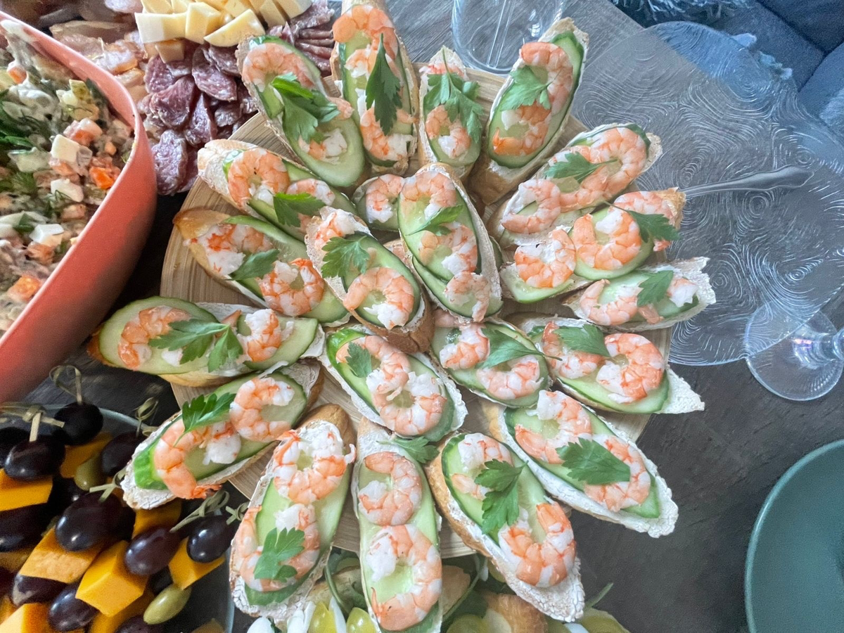 - Выложить сверху огурца по 2-3шт в зависимости от размера креветки