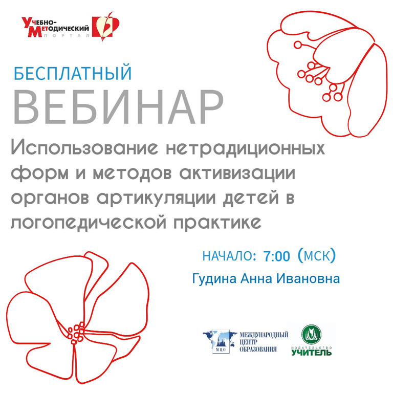 » Дата проведения: 20.02.2026 Начало: 7:00 (МСК) https://www.uchmet.ru/events/item/4053060/ На вебинаре слушатели совместно с ведущим рассмотрят основные понятия: «артикуляция», «биоэнергопластика», «кинезитерапия», «артикуляционная гимнастика», а также познакомятся с нетрадиционными формами и методами воздействия на артикуляционный аппарат ребенка дошкольного возраста. Содержательные вопросы вебинара: 1. Роль и виды артикуляционных упражнений. 2. Требования к инновационным приемам проведения артикуляционной гимнастики с детьми дошкольного возраста. 3. Биоэнергопластика и кинезитерапия как современные нетрадиционные формы активизации органов артикуляции. 4. Использование нетрадиционных форм и методов формирования артикуляционной моторики ребенка: биоэнергопластика, творческие артикуляционные игры, гастрономические артикуляционные игры, артикуляционные игры с предметами. Ведущий вебинара: Гудина Анна Ивановна, учитель-логопед АНОО средняя школа «Бизнес-гимназия» Дзержинского района г