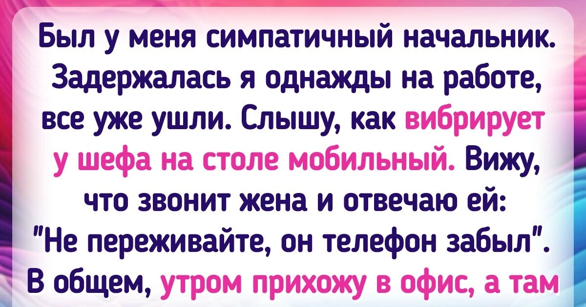 Был у меня симпатичный начальник. Задержалась я однажды на работе, все уже ушли. Слышу, как вибрирует у шефа на столе мобильный. Вижу, что звонит жена и отвечаю ей: «Не переживайте, он телефон забыл». В общем, утром прихожу в офис, а там этот начальник мне взбучку устраивает. Мол, вернулся домой, а жена кричит про развод. И вот так я усвоила один важный урок — никогда не брать в руки чужие телефоны. Жена, кстати, тоже где-то с месяц приходила с проверками в разное время, расспрашивала о моем семейном положении. © omnivorous / Pikabu