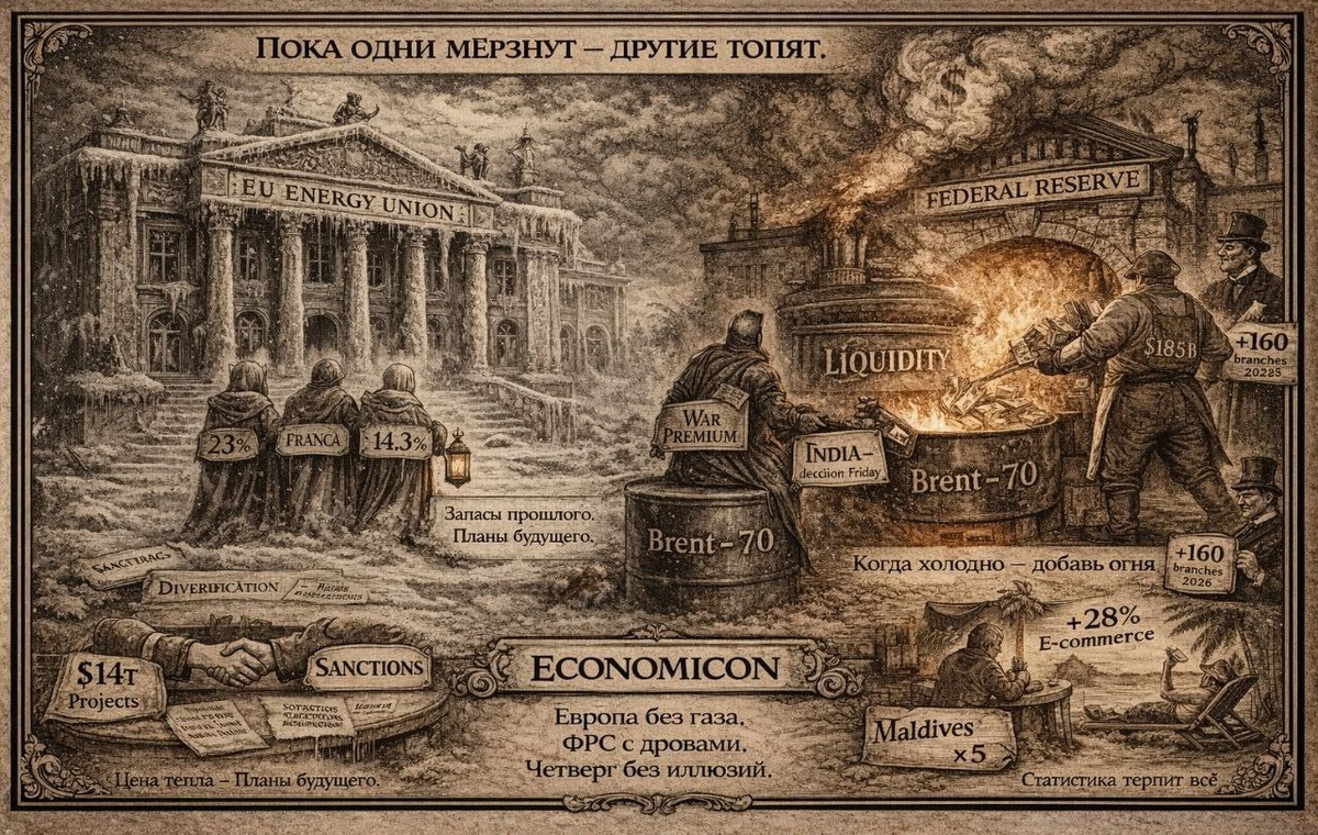 ! На связи утренний дайджест Economicon 😎 ☕️ Утро. Четверг. Китай отдыхает. Европа без газа. Мир торгуется. 💱 Валюта и сырьё на сегодня: $ — ₽76,1524 € — ₽90,2683 ¥ — ₽11,0137 Gold — ~5010 Brent — ~70 🗓 Календарь дня 🇷🇺 Путин переговорит с Набиуллиной по «текущим вопросам». Самая ёмкая формулировка года. 🇨🇳 Китай — нет торгов (Китайский Новый год) 🇭🇰 Гонконг — нет торгов 🇪🇺 12:00 — Current Account (декабрь) 🇺🇸 16:30 — Initial Jobless Claims 🇺🇸 16:30 — Philadelphia Fed Manufacturing Index 🇺🇸 16:30 — торговый баланс 🇺🇸 18:00 — Pending Home Sales 🇺🇸 18:00 — индекс опережающих индикаторов 🇺🇸 18:30 — запасы натгаза EIA 🇺🇸 20:00 — запасы нефти EIA 🏦 Российский корпоративный блок Корпоративная активность сегодня бодрая ▪️ Мосэнерго — ВОСА по дивидендам (0,22606373615 руб. на акцию) ▪️ Софтлайн — МСФО 2025 и IV квартал ▪️ Фармсинтез — ВОСА (дивиденды и допэмиссия 1,1 млрд акций) ▪️ ВТБ — ВОСА по присоединению Почта Банка ▪️ FIXR — возобновление торгов акциями «Фи
