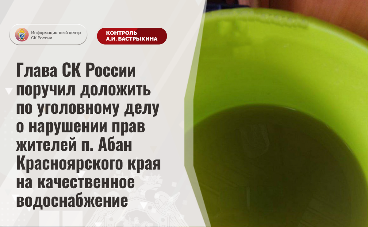 Глава СК России поручил доложить по уголовному делу о нарушении прав жителей п. Абан Красноярского края на качественное водоснабжение В сети Интернет сообщается о нарушении прав жителей поселка Абан Красноярского края на качественное водоснабжение. На протяжении года в жилые помещения граждан на улице Пионерской поступает жизненно необходимый коммунальный ресурс, непригодный для потребления и бытовых нужд ввиду наличия примесей, осадков и неестественного цвета. В ходе исследования установлено, что вода не соответствует санитарно-гигиеническим нормам. Мер к устранению нарушений не принимается. В ГСУ СК России по Красноярскому краю и Республике Хакасии возбуждено уголовное дело. Председатель Следственного комитета Российской Федерации Александр Иванович Бастрыкин поручил руководителю ГСУ СК России по Красноярскому краю и Республике Хакасии Алексею Леонидовичу Еремину доложить о предварительных и окончательных результатах расследования уголовного дела. Исполнение поручения поставлено на к