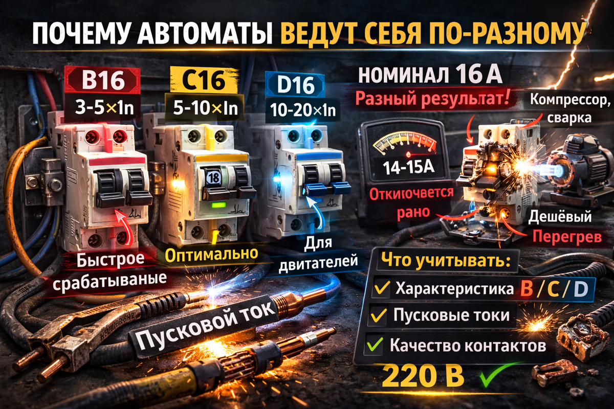 Берут самый дешёвый 16А и ставят «как у всех». Потом удивляются, почему при сварке выбивает. Правильно: