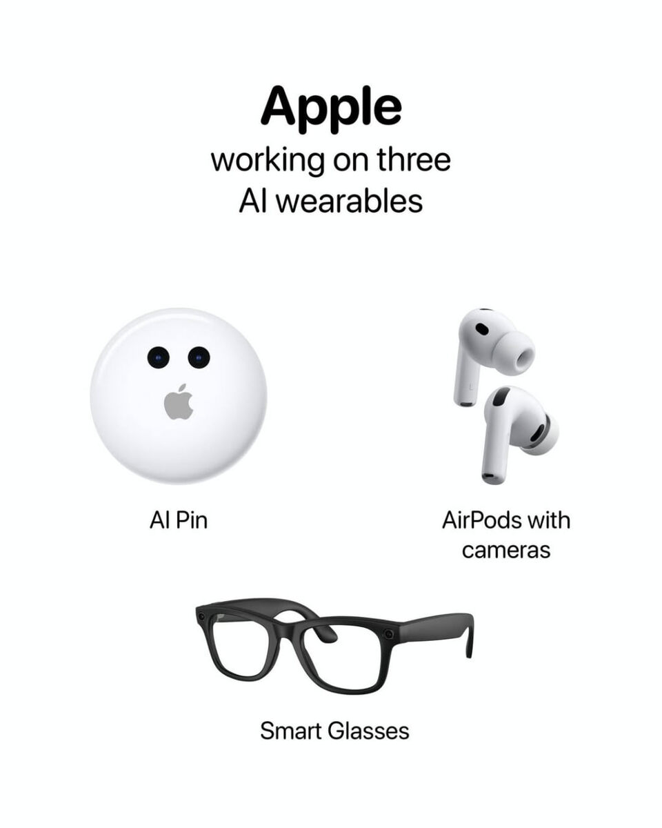 : ⏺Умные очки (старт производства — конец 2026) ⏺ИИ-кулон размером с AirTag (камера + микрофон, "глаза и уши" iPhone) ⏺AirPods с камерой 🤷🏻♂️ Всё завязано на обновлённую Siri с визуальным контекстом. Кулон — по сути Humane AI Pin, но как аксессуар к iPhone, а не отдельное устройство. Сайт Humane AI Pin, я не смог найти, походу закрылись. Очки от Apple с ИИ думаю зайдёт, а остальное не уверен, наушники с камерой? 😐 🤖 В эпоху AI