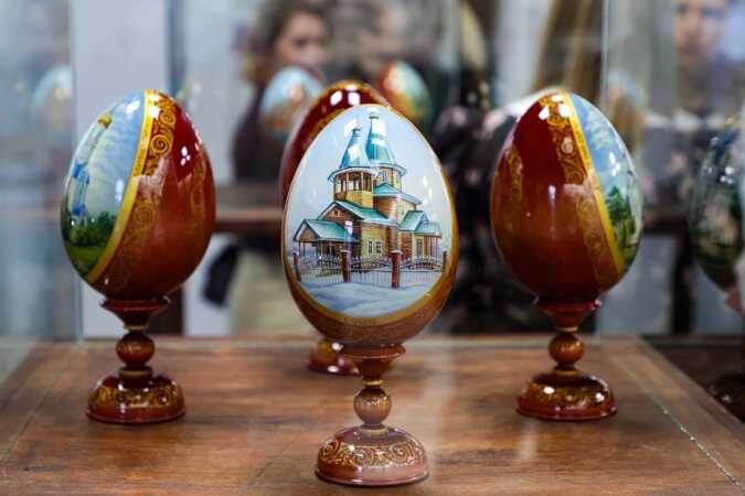 Экспозиция объединила более 20 работ, выполненных командой художников-иконописцев из мастерской «Аксиос» в каноническом и академическом стилях. Кроме того, на выставке представлен результат нового краеведческого проекта Алены Гришуниной по созданию серии пасхальных яиц с изображением храмов и часовен Новосибирской области, разрушенных при советской власти. Изображения часовни святителя Николая (какой она была изначально), собора во имя святого благоверного князя Александра Невского, Вознесенского кафедрального собора в Новосибирске, а также снесенной в прошлом веке церкви в честь Святой Живоначальной Троицы в селе Вьюны Колыванского района, восстановленные благодаря архивным документам, уже нанесены на декоративные пасхальные яйца.