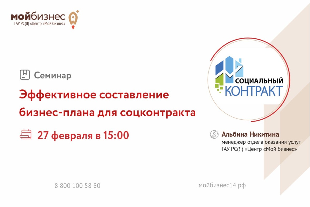» На семинаре участники узнают о социальном контракте и научатся самостоятельно разрабатывать бизнес-план, а также познакомятся со всеми критериями для его заполнения 📊Программа семинара: — Что такое социальный контракт? — Перечень необходимых документов — Правила разработки бизнес-плана для соцконтракта — Составление финансового плана — Ответы на вопросы. 📅Дата: 27.02.2026 г. ⏰Время: 15:00-16:00 📍Место: г.Якутск, ул. Кирова 18Б, 1 этаж, конференц зал 🎤Спикер: Альбина Никитина, менеджер отдела оказания услуг ГАУ РС(Я) «Центр «Мой бизнес» 🔗Ссылка для регистрации: https://forms.yandex.ru/cloud/69952a565056903eef657068 📲Напоминаем, что канал Центра "Мой бизнес" запущен в МАХе. Подпишитесь, чтобы оставаться в курсе последних новостей! @moibizsakha