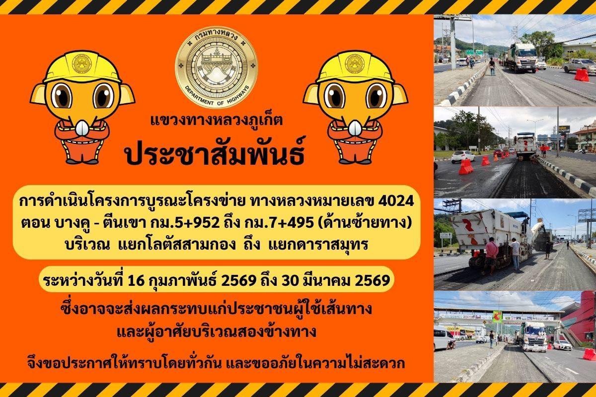 Дорожные работы на участке Bypass Rd. от тоннеля Samkong Underpass (у супермаркета Lotus's Extra) до тоннеля Darasamut Underpass (ТЦ Central Phuket) займут более полутора месяцев и завершатся не раньше конца марта. Соответствующее заявление сделал Департамент скоростных магистралей Пхукета. Уведомление дорожного ведомства было опубликовано 18 февраля. Дата начала работ в нем указана как 16 февраля, дата окончания – как 30 марта. Подробностей касательно графика работ Департамент скоростных магистралей не привел, но редакция «Новостей Пхукета» на личном опыте убедилась, что они ведутся только на полосах для движения от Lotus's на юг, к Central. Ранее такой же срок – с 16 февраля по 30 марта – был заявлен для работ по замене дорожного полотна в обоих тоннелях на Bypass Rd. Официальные лица добавили, что асфальт необходимо поменять на обеих частях дороги, но начнут рабочие с полос для движения на север. Стартовавшие в январе работы на наземном участке Bypass Rd. к северу от Samkong Und