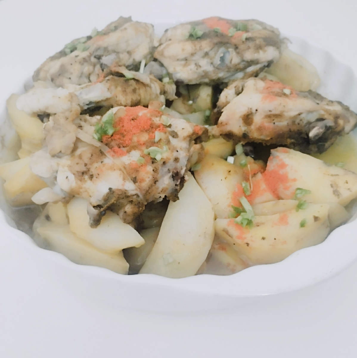 Бëдрышки очистить от кожицы, промыть и натереть со всех сторон приправой. Положить сверху картофеля.