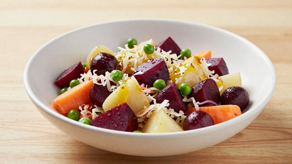 Хороший винегрет начинается с качественных ингредиентов. Обратите внимание на свеклу, картофель и морковь — они должны быть хорошо отварены, но не разварены, чтобы держать форму при нарезке. Зеленый горошек лучше выбирать консервированный, он должен быть достаточно упругим. Лук предпочтительнее репчатый, но можно использовать и красный для более мягкого вкуса.