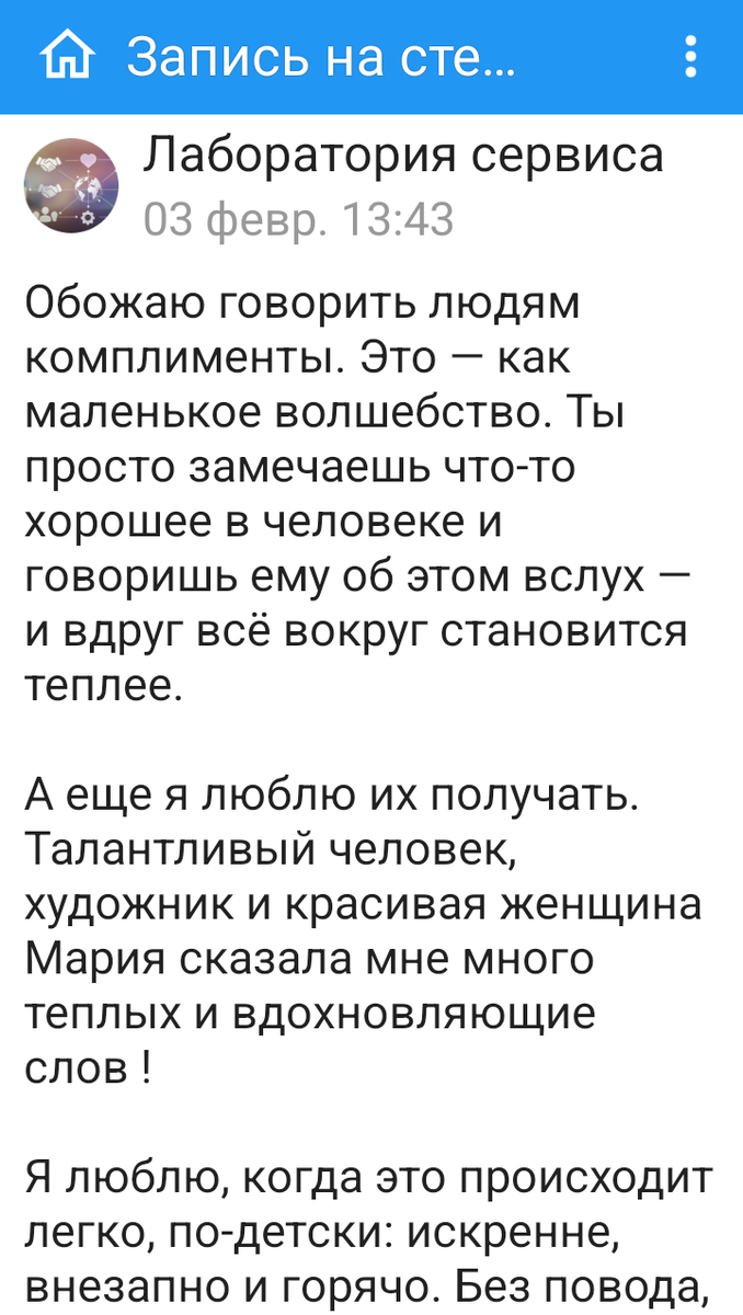 Дорогие читатели, здравствуйте. Сегодня мы хотим вам показать текст от нашего специалиста по сервису, который обожает говорить людям комплименты. У нас есть специальная подборка, где вы можете прочитать публикации о сервисе. Она называется "Лаборатория сервиса".