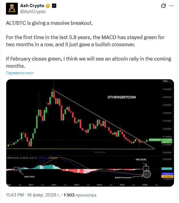 Впервые за последние 5,8 лет индикатор MACD остается зеленым два месяца подряд и только что сформировал «бычье пересечение». Если февраль закроется в зеленой зоне, думаю, в ближайшие месяцы нас ждет ралли альткоинов.